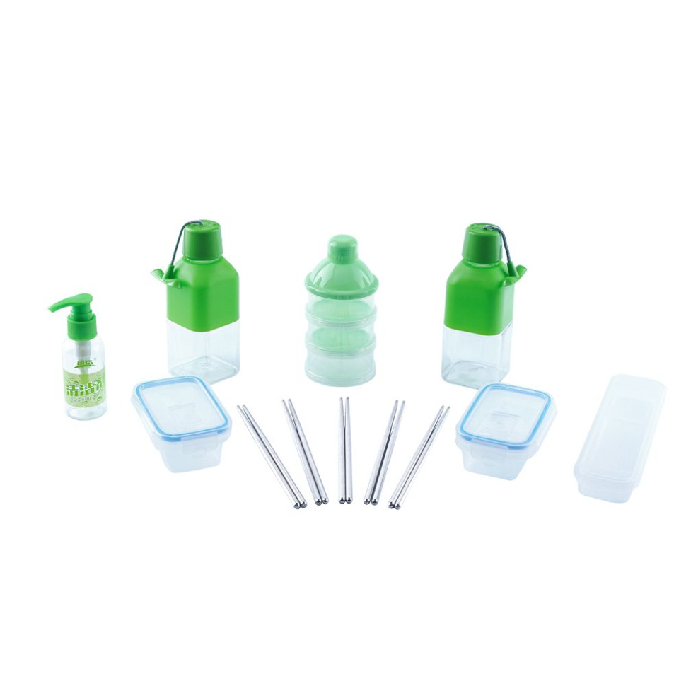 Комплект також включає ряд дрібного посуду та інших аксесуарів, серед них: казанок із кришкою, сковорідка з антипригарним покриттям (26 см х 9 см), 2 супові тарілки, 2 тарілки для других страв, 5 чаш, 2 харчові контейнери, 2 пляшки для приправ, пляшка для миючого засобу, обробна дошка, ніж для різання овочів, дерев'яна лопатка, половник, друшляк, кейс із 5 парами паличок для їжі, рушник, вітрозахисний екран, шланг і перехідники для пальників, 6 заглушок на ніжки столу для більшої стійкості.
