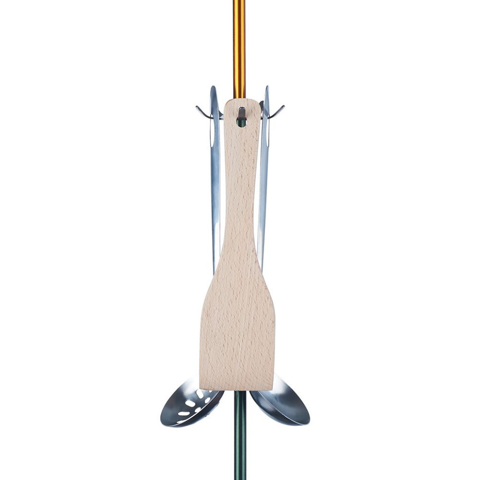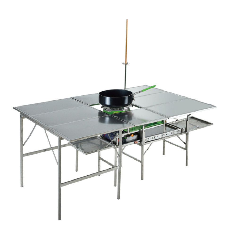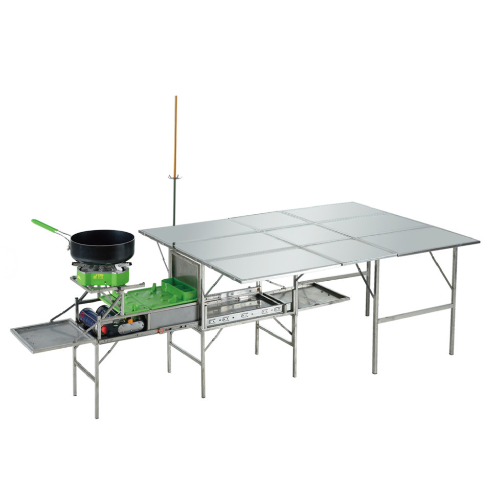 Всі елементи набору компактно вміщаються на поверхні столу, де кожному відведено своє місце. У вечірній час над столом можна підвісити кемпінгову лампу — для цього призначена довга стійка з гачком.