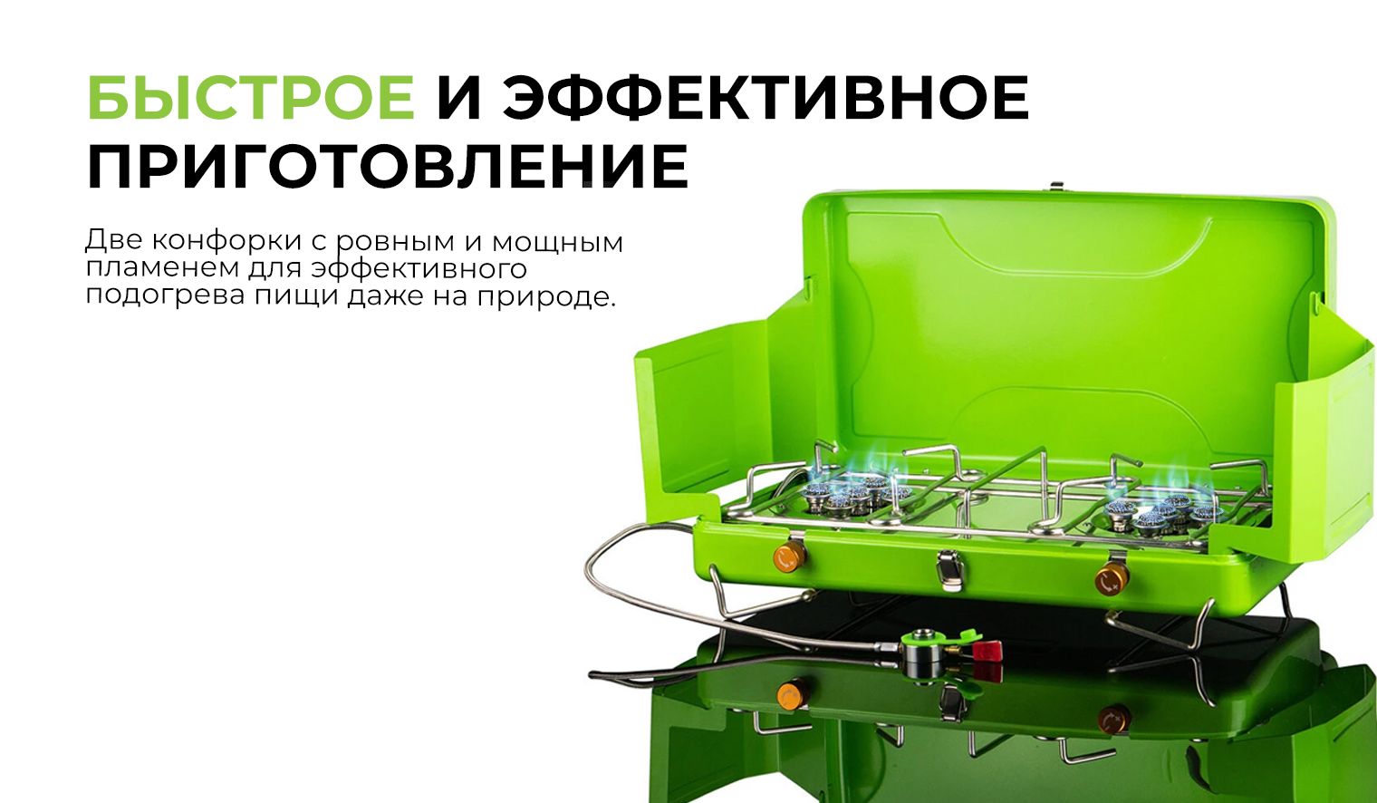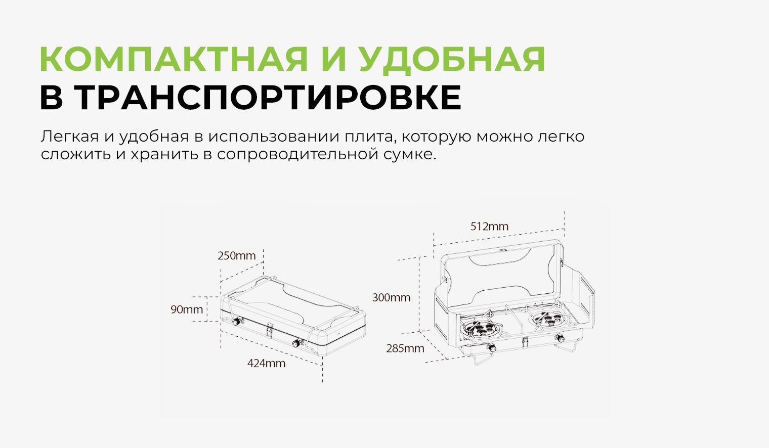 Газовая плита для приготовления еды в полевых условиях. Пригодится вам в туризме, во время активного отдыха. Топливо – бутан, метод поджига – внешний источник. Такая модель даёт мощное и ровное пламя для эффективного подогрева, она надёжная и удобная в применении. Размеры: 512*300*285 миллиметров. В сложенном положении габариты: 424*250*90 миллиметров. Вес составляет 3 килограмма.