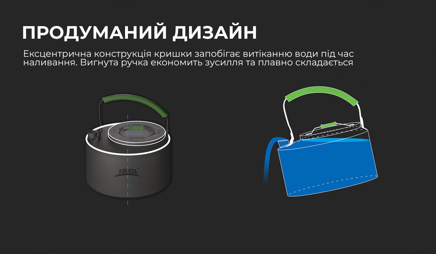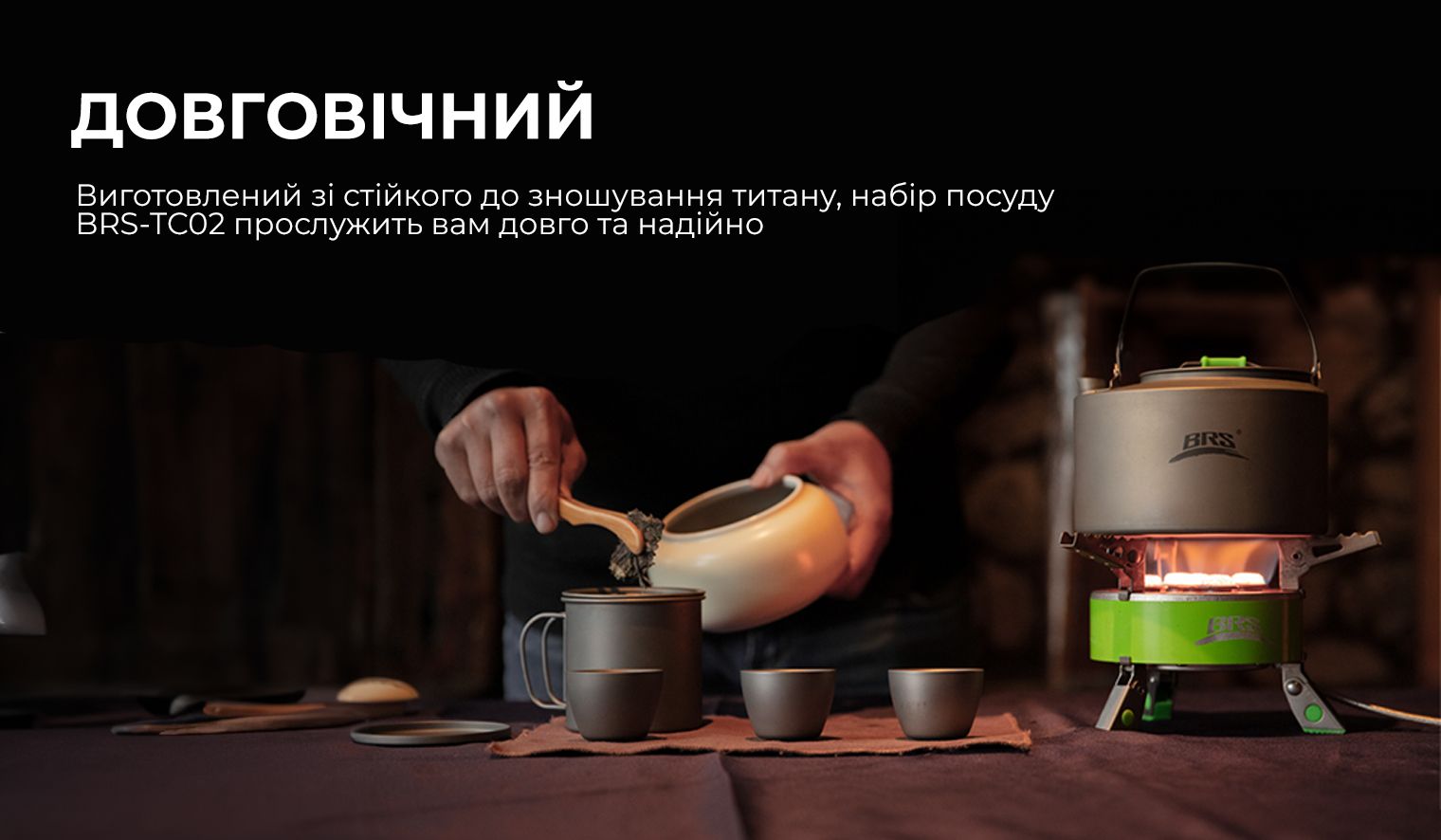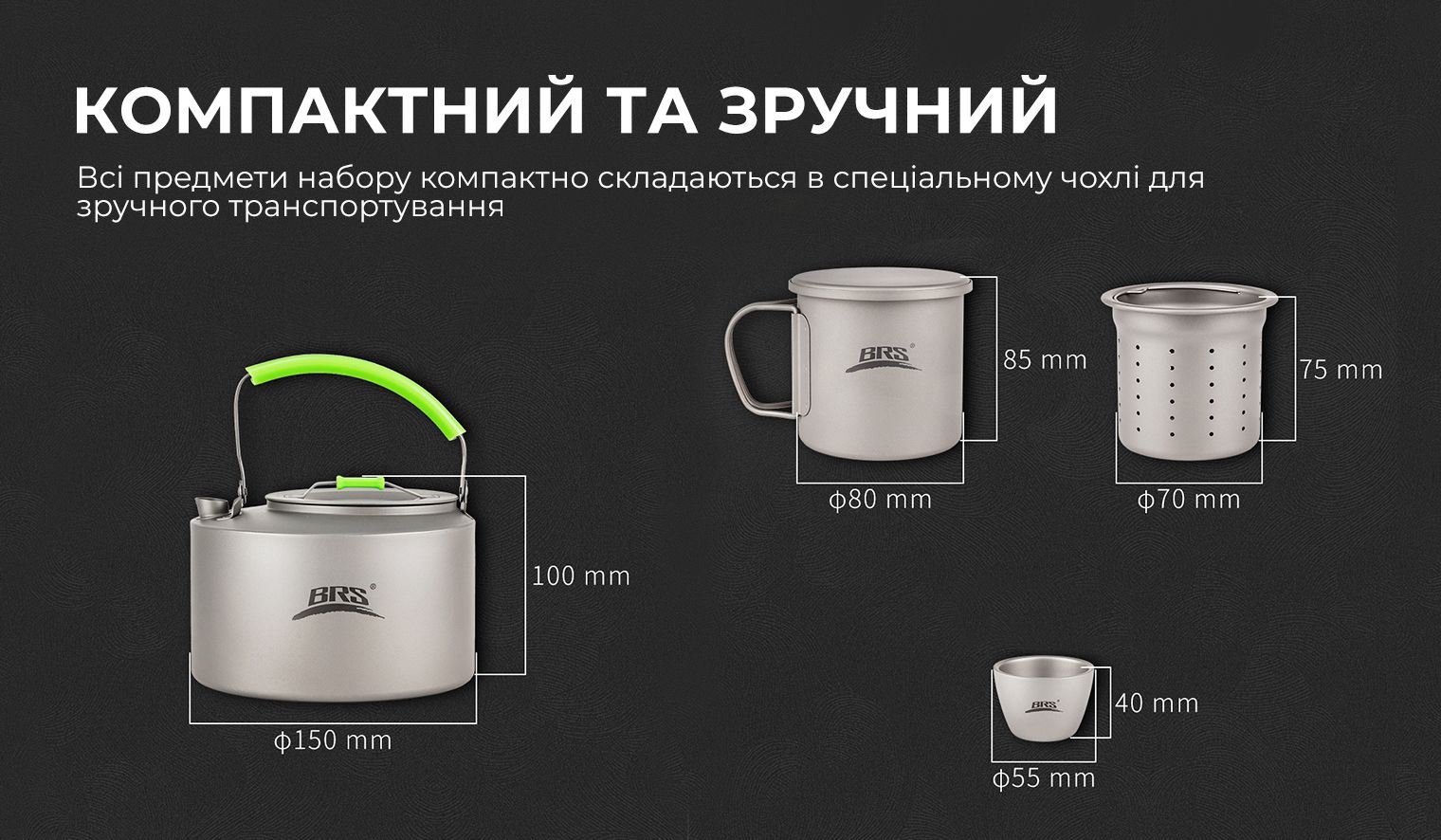 Набор посуды состоит из чайника, кружки, трёх чашек, а также ситечка для чая. Все предметы изготовлены из титана, это прочная и устойчивая к изнашиванию посуда, рассчитанная на применение в активном отдыхе. Все изделия компактно складываются одно в другое, поэтому переносить их будет достаточно просто. Это весьма комфортно в туризме и иных видах активного времяпровождения. Посуду можно класть в специальный чехол, и в таком виде её транспортировать.