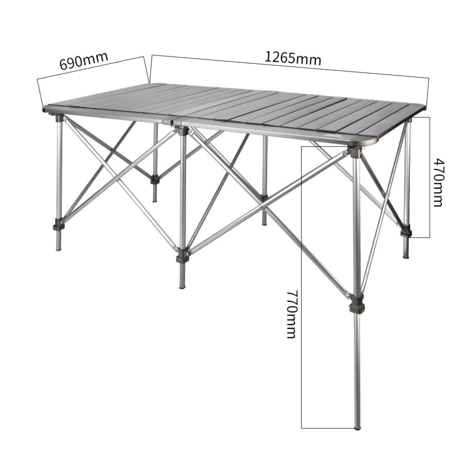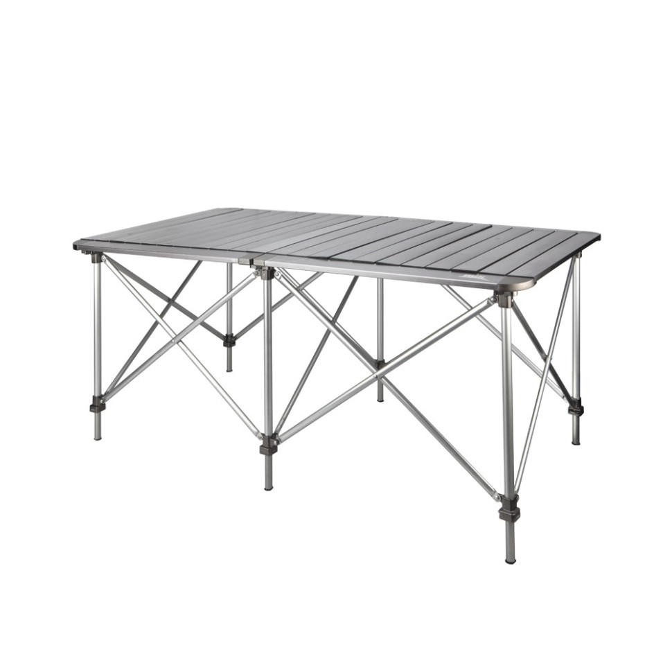 туристичний стіл зі складаною конструкцією; матеріал – алюмінієвий сплав; розміри стільниці у встановленому положенні – 126.5 х 69 сантиметрів; висота кожної ніжки регулюється у межах 47-77 сантиметрів; розміри конструкції у складеному вигляді – 73 х 25 сантиметрів; вага – 6.7 кілограмів; фірмовий чохол для зберігання у комплекті. array:1 [